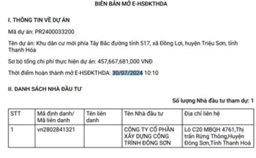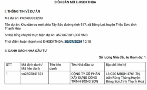 Công ty cổ phần Xây dựng công trình Đông Sơn là nhà đầu tư duy nhất đăng ký thực hiện Dự án Khu dân cư mới phía Tây Bắc đường tỉnh 517, xã Đồng Lợi, huyện Triệu Sơn, tỉnh Thanh Hóa.