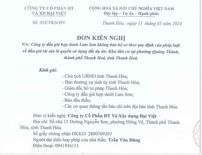 Tuy nhiên, ngày 13/5/2024, Công ty Cổ phần ĐT và XD Đại Việt (Công ty Đại Việt) đã có đơn Kiến nghị gửi lên Chủ tịch UBND tỉnh Thanh Hóa, Ban thường vụ tỉnh ủy tỉnh Thanh Hóa, Giám đốc Sở Tư pháp...về việc Công ty đấu giá hợp danh Lam Sơn không bán hồ sơ theo quy định của Pháp luật về đấu giá tài sản là quyền sử dụng đất dự án: Khu dân cư tại phường Quảng Thành, TP.Thanh Hóa, tỉnh Thanh Hóa.