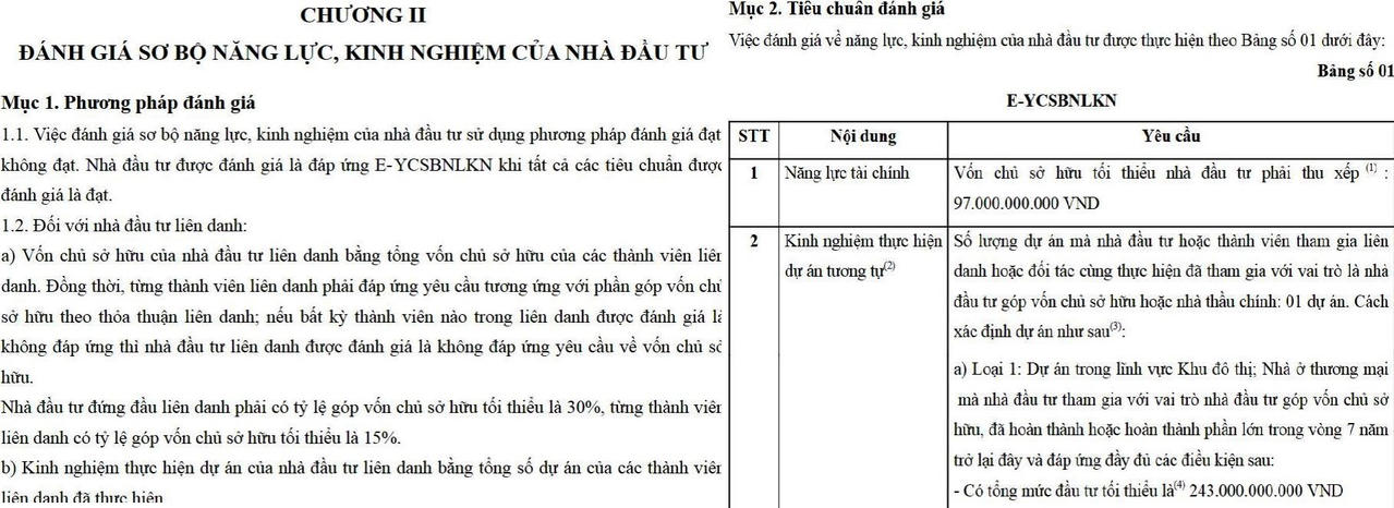 Ngoài ra, nhà đầu tư phải có kinh nghiệm thực hiện các dự án tương tự trong vai trò thành viên liên danh, hoặc đối tác cùng thực hiện dự án với tư cách là nhà đầu tư góp vốn chủ sở hữu của 1 dự án có tổng mức đầu tư tối thiểu 243 tỷ đồng đã hoàn thành hoặc hoàn thành phần lớn trong vòng 7 năm trở lại đây. Trong đó, nhà đầu tư góp vốn chủ sở hữu giá trị tối thiểu 48,5 tỷ đồng.