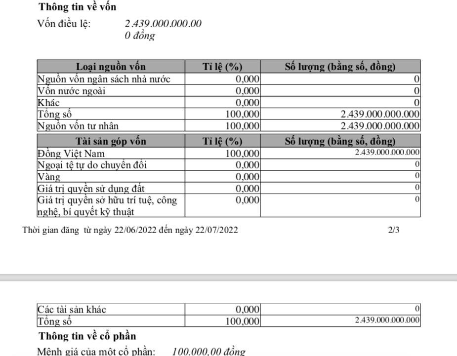 Tiếp đó, tại ngày 22/6/2022, công ty lại nâng vốn điều lệ lên 2.439 tỷ đồng. Cổ đông góp vốn không được đề cập. Khi này người đại diện theo pháp luật là Lê Thanh Hải, chức vụ Tổng giám đốc.