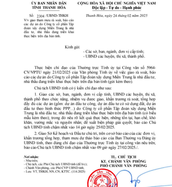 Theo đó, UBND tỉnh Thanh Hóa giao các sở, ban, ngành, UBND các huyện, thị xã, thành phố rà soát, tổng hợp đầy đủ các dự án (gồm: dự án đầu tư công, dự án đầu tư có sử dụng đất, dự án đầu tư theo hình thức PPP...) do Công ty cổ phần Tập đoàn Xây dựng Miền Trung là nhà đầu tư, nhà thầu đang triển khai thực hiện trên địa bàn tỉnh Thanh Hóa.