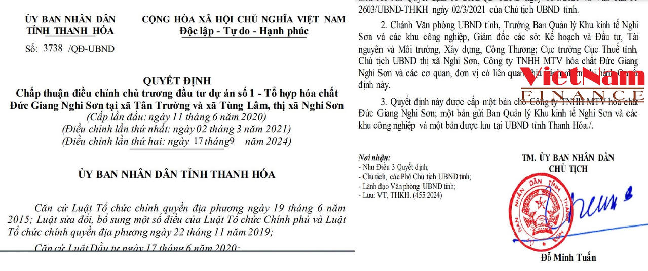 Ngày 17/9/2024, Chủ tịch UBND tỉnh Thanh Hoá Đỗ Minh Tuấn ký quyết định chấp thuận điều chỉnh chủ trương đầu tư dự án số 1 - Tổ hợp hóa chất Đức Giang Nghi Sơn tại xã Tân Trường và xã Tùng Lâm, Thị xã Nghi Sơn cho Công ty TNHH MTV hóa chất Đức Giang Nghi Sơn.