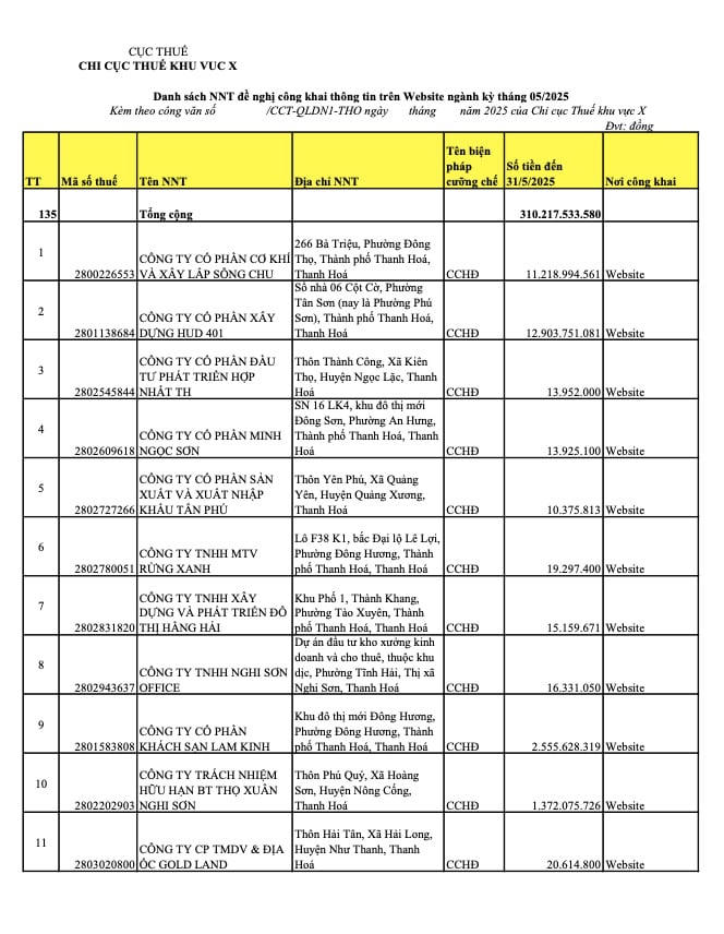 Tính đến ngày 31/5/2025, tổng số nợ thuế trên địa bàn tỉnh Thanh Hóa là hơn 310 tỷ đồng, trong đó 15 doanh nghiệp đứng đầu gồm Xi măng Công Thanh, Xây dựng số 5, Ba La - Bỉm Sơn, Sông Đà 4,... chiếm phần lớn tổng số nợ thuế với gần 260 tỷ đồng.