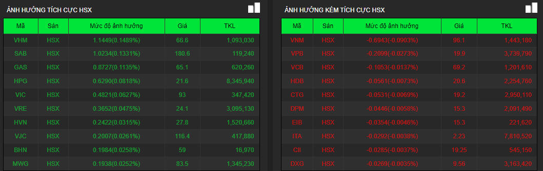 Tuy nhiên, áp lực rung lắc cũng chưa biến mất và nhanh chóng xuất hiện trở lại khiến hàng loạt cổ phiếu vốn hóa lớn đảo chiều, bên cạnh đó, đà tăng của một số cổ phiếu trụ cột cũng bị thu hẹp lại đáng kể. Sự phân hóa là diễn biến chủ đạo của thị trường chứng khoán ở phiên chiều. Trong đó, các cổ phiếu như HSG, HPG, SAB, VGC, PVS, GAS… là nhóm giúp duy trì sắc xanh của các chỉ số . Trong đó, HSG được kéo lên mức giá trần với dư mua giá trần đến 9,6 triệu cổ phiếu. HPG tăng 3,8% lên 21.600 đồng/cp.