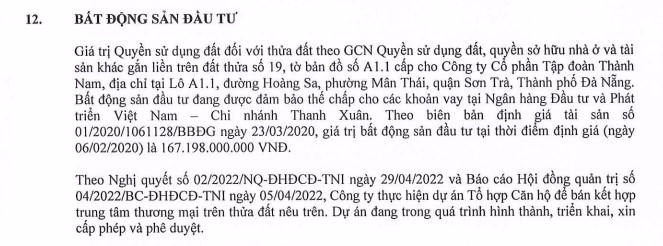 Trước đó, tại Báo cáo tài chính 6 tháng đầu năm của Thành Nam có đề cập đến khu đất này. đang được đảm bảo thế chấp cho các khoản vay của công ty Thành Nam tại Ngân hàng BIDV. Giá trị bất động sản đầu tư tại thời điểm định giá (6/2/2020) là hơn 167 tỷ đồng. Còn nguyên giá ghi nhận tại ngày 30/6/2022 là gần 153 tỷ đồng.