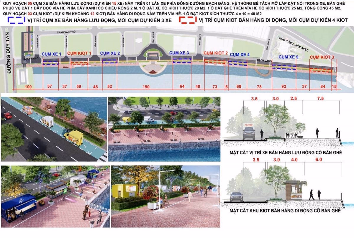 Trên làn xe phía Đông đường Bạch Đằng sẽ bố trí 5 cụm xe bán hàng lưu động (mỗi cụm 3 xe), xen kẽ với 3 cụm kios bán hàng di động (mỗi cụm 4 kios) trên toàn tuyến vỉa hè phía Đông đường Bạch Đằng. Các kios sẽ sử dụng container 20 feet khô (dài 6m, rộng 2,5m) và do hộ kinh doanh tự đầu tư, trang trí.