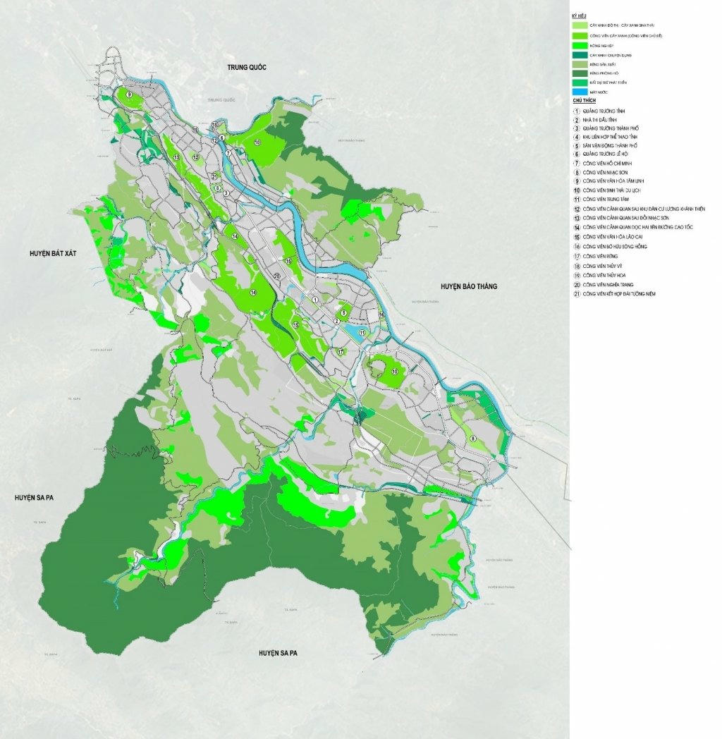 Theo đó, đề án Điều chỉnh Quy hoạch chung xây dựng TP. Lào Cai đến năm 2045 đã đề xuất một hướng phát triển không gian xanh (bao gồm hệ thống các công viên) như sau: Xây dựng một mạng lưới không gian công cộng trải dài từ Bắc đến Nam trên địa bàn thành phố và theo dọc sông Hồng, tận dụng tiềm năng du lịch ven sông Hồng và kết hợp với quần thể du lịch tâm linh, di tích lịch sử liên kết với du lịch cửa khẩu quốc tế. Trong đó, tập trung vào việc phát triển hệ thống các công viên: