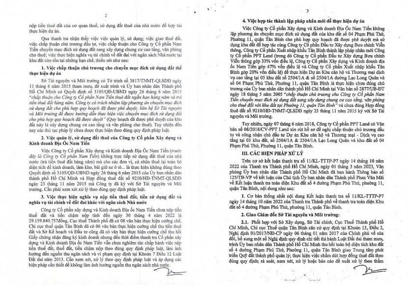 Giao Cục Cục trưởng Cục Thuế TP Hồ Chí Minh phối hợp Công an TP Hồ Chí Minh và Sở Tài chính tham mưu các biện pháp cần thiết để thu hồi đúng, đủ tiền thuê đất, thuế đất, tiền chậm nộp và nghĩa vụ tài chính về đất đai khác liên quan đến khu đất trên để nộp ngân sách nhà nước. Trong trường hợp Công ty Cổ phần Xây dựng và Kinh doanh địa ốc Nam Tiến không nộp đầy đủ theo thông báo của cơ quan thuế thì báo cáo đề xuất UBND TP Hồ Chí Minh xử lý nghiêm theo quy định pháp luật.
