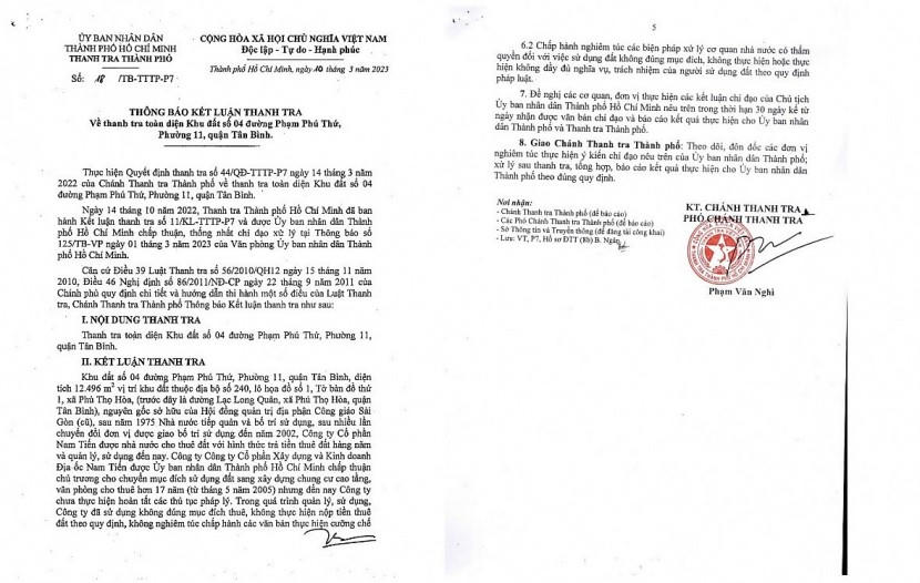 Cụ thể, Thanh tra TP Hồ Chí Minh vừa có thông báo kết luận số 18/TB-TTTP-P7 thanh tra toàn diện khu đất số 4 đường Phạm Phú Thứ, phường 11, quận Tân Bình.