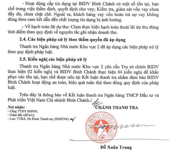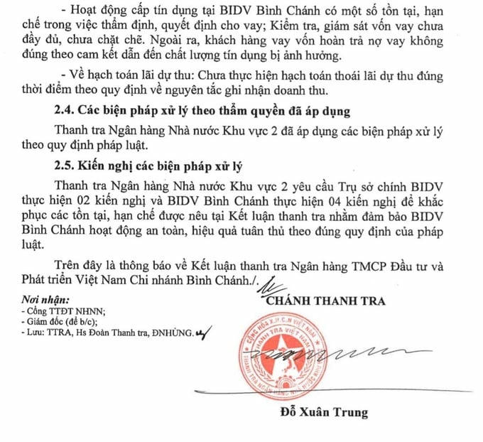Chánh Thanh tra, giám sát Ngân hàng Nhà nước chỉ ra một số tồn tại, hạn chế tại chi nhánh BIDV Bình Chánh trong việc thẩm định, quyết định cho vay; Kiểm tra, giám