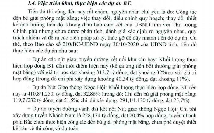Việc lập, thẩm định, phê duyệt báo cáo nghiên cứu khả thi, ký kết hợp đồng BT còn có một số sai sót trong áp dụng định mức, đơn giá, biện pháp thi công, đền bù giải phóng mặt bằng và đưa một số hạng mục vào DA đầu tư chưa đúng quy định, làm tăng tổng mức đầu tư 3 DA lên 499,202 tỉ đồng. Phê duyệt kết quả lựa chọn NĐT, đàm phán và ký kết hợp đồng 3 DA BT có giá trị hợp đồng BT cao hơn giá trị DA BT được tỉnh phê duyệt trong kế hoạch lựa chọn NĐT là: 73,49 tỉ đồng, là vi phạm về nguyên tắc xét duyệt trúng thầu…