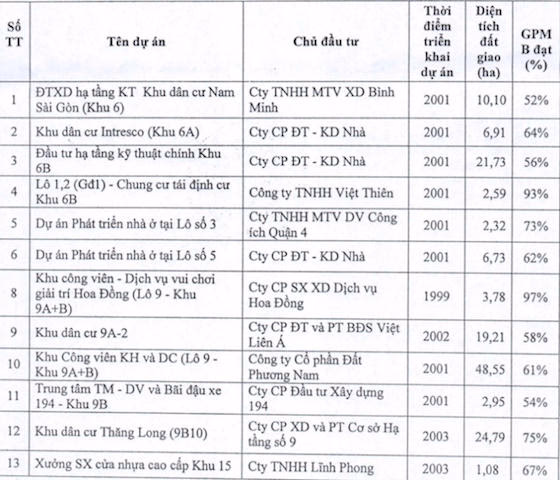 Do đó, tổ công tác liên ngành kiến nghị Thủ tướng chỉ đạo UBND TP.HCM xem xét, thu hồi 13 dự án trong Khu đô thị phía Nam đã được giao đất từ năm 1999 đến 2003 nhưng chưa hoàn thành giải phóng mặt bằng, chưa thực hiện nghĩa vụ tài chính đất đai, chưa đầu tư xây dựng.