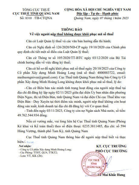 Ngày 7/11/2023, Cục Thuế Quảng Nam ban hành thông báo số 8310 về việc người nộp thuế không được khôi phục mã số thuế do Công ty CP Xây dựng Minh Hoàng Long còn nợ NSNN số tiền gần 49,7 tỷ đồng tính đến ngày 3/11/2023. Đồng thời, theo Biên bản xác minh tình trạng hoạt động của người nộp thuế ngày 2/11/2023, người nộp thuế không còn hoạt động sản xuất kinh doanh tại địa chỉ đã đăng ký với Cơ quan thuế.