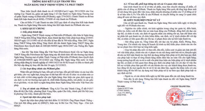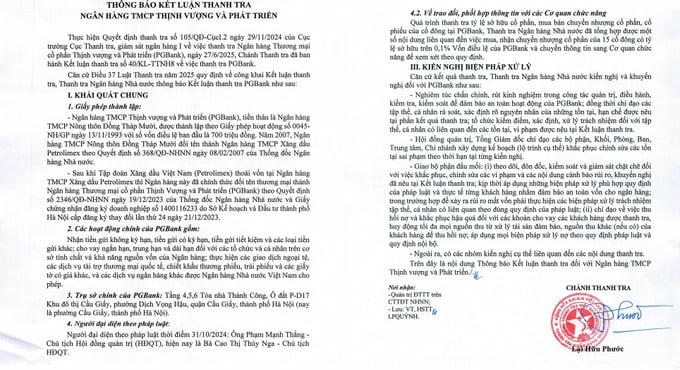Thanh tra Ngân hàng Nhà nước yêu cầu PGBank cần nghiêm túc chấn chỉnh, rút kinh nghiệm về công tác quản trị, điều hành, kiểm tra, kiểm soát.