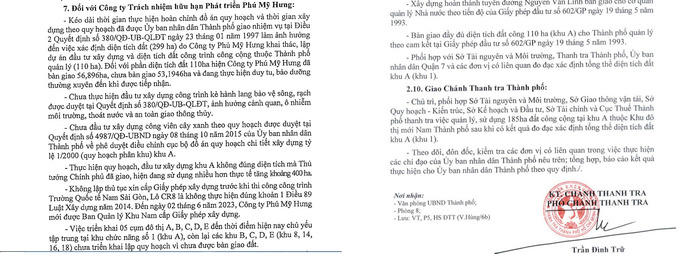 Theo kết luận thanh tra chỉ rõ, Công ty Phú Mỹ Hưng kéo dài thời gian thực hiện hoàn chỉnh đồ án quy hoạch và thời gian xây dựng theo quy hoạch đã được UBND TP.HCM giao nhiệm vụ tại Điều 2 Quyết định số 380/QĐ-UB-QLĐT ngày 23/1/1997, làm ảnh hưởng đến việc xác định diện tích đất (299 ha) do Công ty Phú Mỹ Hưng khai thác, lập dự án đầu tư xây dựng và diện tích đất công trình công cộng thuộc Tp.HCM quản lý (110ha).