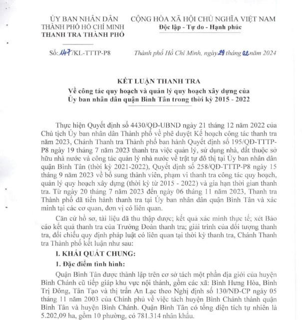 Thanh tra Tp.HCM vừa ban hành kết luận thanh tra số 147/KL-RRRP-P8 về công tác quy hoạch và quản lý quy hoạch xây dựng của UBND quận Bình Tân trong thời kỳ 2015 - 2022.