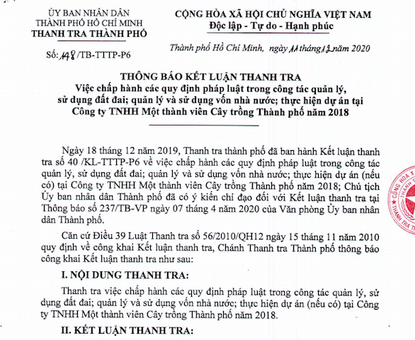 Mới đây, Thanh tra TP HCM đã có thông báo kết luận việc chấp hành các quy định pháp luật trong công tác quản lý sử dụng đất đai; quản lý và sử dụng vốn nhà nước; thực hiện dự án tại Công ty Cây trồng TP.HCM năm 2018.