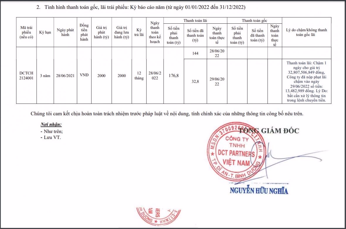 Theo thông tin được công bố trên Sở giao dịch Chứng khoán Hà Nội (HNX), DCT Group vừa có văn bản công bố thông tin định kỳ về thanh toán gốc, lãi trái phiếu. Theo đó, vào ngày 28/6/2022 doanh nghiệp phải thanh toán lãi đối với lô trái phiếu có mã DCTCH2124001 176,8 tỷ đồng. Tuy nhiên, vào ngày 28/6 doanh nghiệp mới chỉ thanh toán số tiền là 144 tỷ đồng (tức còn thiếu 32,8 tỷ đồng). Sau đó 1 ngày (vào ngày 29/6/2022) doanh nghiệp đã thanh toán nốt số tiền còn thiếu là 32,8 tỷ đồng. Như vậy, DCT đã thanh toán chậm một ngày so với kế hoạch và phải chịu phạt 13,5 triệu đồng.