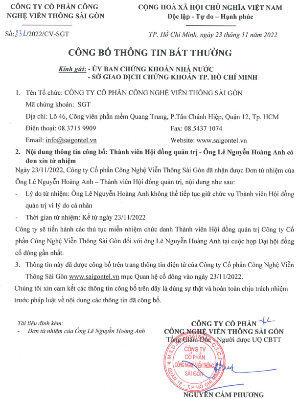 Cụ thể, ngày 23/11, Saigontel đã nhận được đơn xin từ nhiệm vị trí thành viên HĐQT của ông Lê Nguyễn Hoàng Anh với lý do cá nhân. Công ty sẽ tiến hành các thủ tục miễn nhiệm chức danh thành viên HĐQT của ông Lê Nguyễn Hoàng Anh tại cuộc họp Đại hội đồng cổ đông gần nhất.