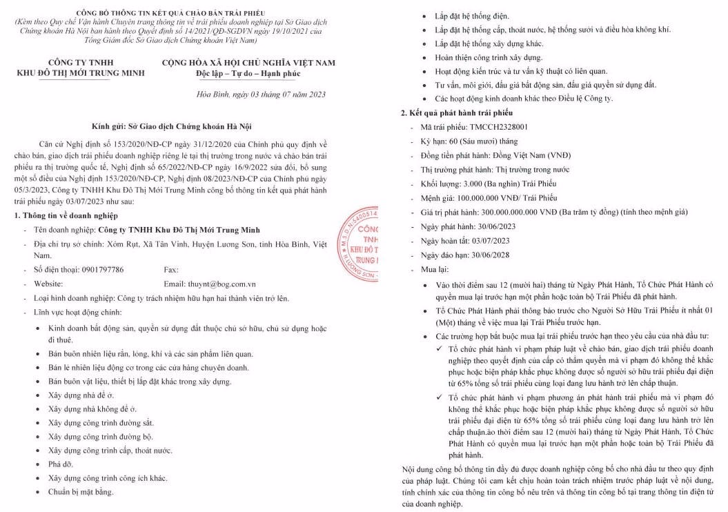 Công ty TNHH Khu đô thị mới Trung Minh cho biết huy động 300 tỷ đồng từ kênh trái phiếu trong nước, thông qua việc hoàn tất phát hành 3.000 trái phiếu, mệnh giá 100 triệu đồng/ trái phiếu vào ngày 3/7 vừa qua.