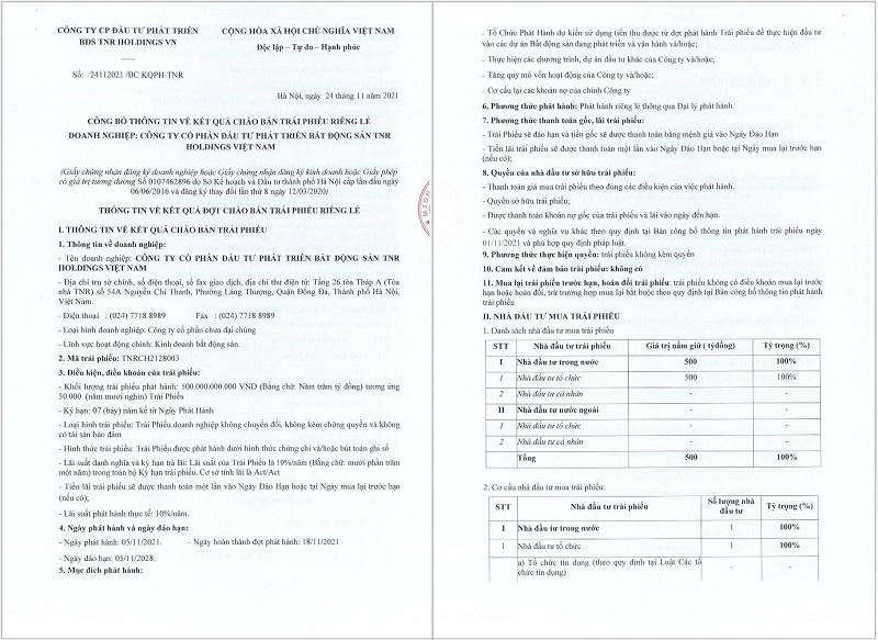 Cũng theo thống kê từ Sở Giao dịch chứng khoán Hà Nội, kể từ đầu tháng 11/2021 đến nay TNR Holdings đã ba lần công bố vay vốn thành công từ kênh trái phiếu với tổng giá trị 1.500 tỷ đồng. Các lô trái phiếu này đều có kỳ hạn 7 năm và đáo hạn vào năm 2028 với cùng mục đích.