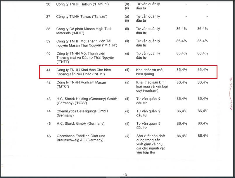 Được biết, hiện vốn góp của Khoáng sản Núi Pháo đạt 10.792 tỷ đồng hoạt động trong lĩnh vực khai khoáng, bao gồm Công ty TNHH MTV thương Mại và Đầu tư Thái Nguyên góp 20%, 80% còn lại thuộc về Công ty TNHH MTV Tài Nguyên Masan Thái Nguyên (MRTN). Trong khi MRTN là công ty con của Công ty cổ phẩn Masan High-Tech Materials (trước đây gọi là CTCP Tài nguyên Masan). Qua đó, Masan High-Tech Materials gián tiếp nắm quyền kiểm soát Công ty Núi Pháo.