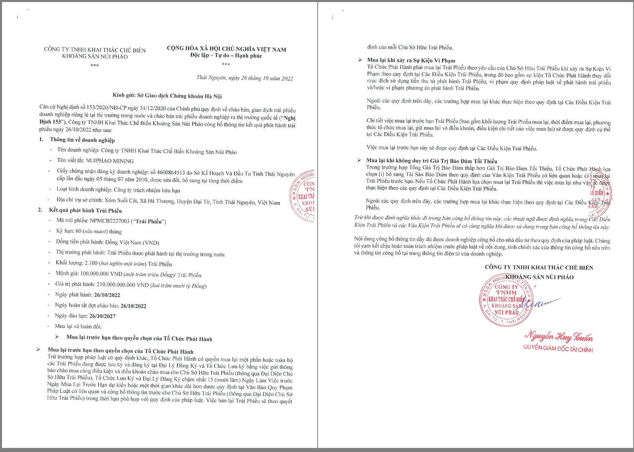 Theo thông tin từ Sở giao dịch chứng khoán Hà Nội (HNX), ngày 26/10/2022 Công ty TNHH Khai thác Chế biến Khoáng sản Núi Pháo vừa phát hành thành công lô trái phiếu có mã NPMCB2227003 với kỳ hạn 60 tháng, đáo hạn vào ngày 26/10/2027.
