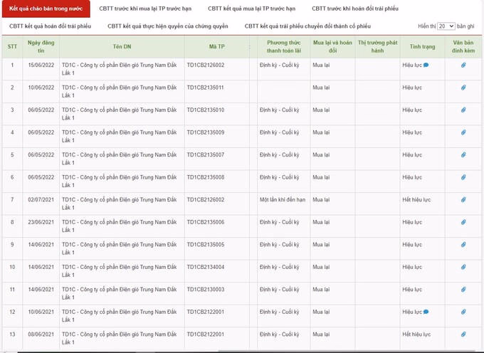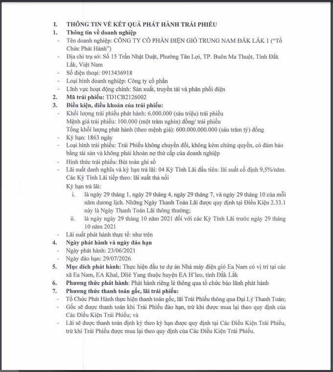 Cụ thể, 4 lô trái phiếu được Trung Nam Đắk Lắk 1 phát hành trước đó với các mã trái phiếu lần lượt là: TD1CB2135010, TD1CB2135009, TD1CB2135007 và TD1CB2135008.