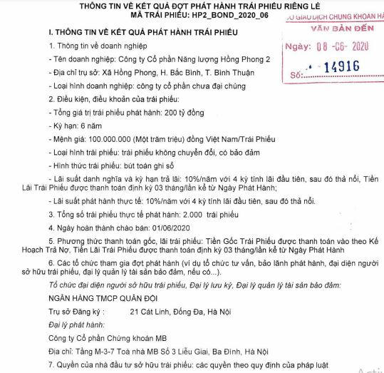 Theo đó, Hồng Phong 1 đã phát hành liên tiếp 2 lô trái phiếu gồm 1 lô 2.150 tỷ đồng có kỳ hạn 15 năm và 1 lô 400 tỷ đồng có kỳ hạn 5 năm. Cả 2 lô trái phiếu này đều là trái phiếu không chuyển đổi, không phải là nợ thứ cấp và được bảo lãnh thanh toán bởi CGIF.