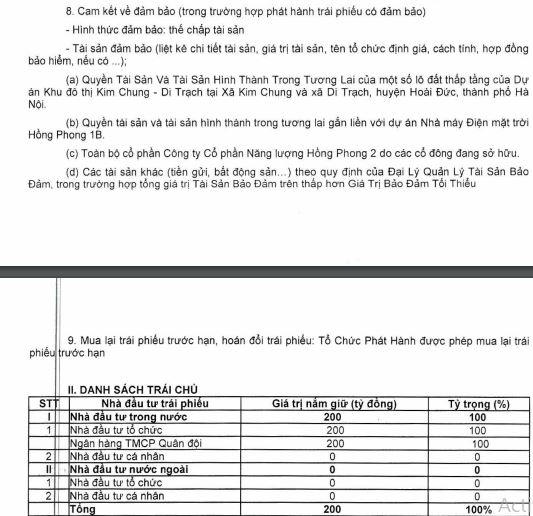 Đồng thời, công ty này cũng sử dụng quyền tài sản, tài sản hình thành trong tương lai gắn liền với dự án Nhà máy điện mặt trời Hồng Phong 1B và toàn bộ cổ phần của các cổ đông sở hữu tại Hồng Phong 2 để đảm bảo cho các lô trái phiếu trên.