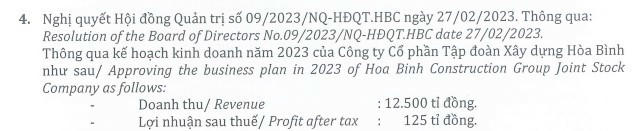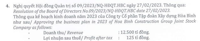 Trước những diễn biến của thị trường, CTCP Tập đoàn Xây dựng Hòa Bình (mã HBC) vừa công bố nghị quyết của Hội đồng quản trị (HĐQT) thông qua kế hoạch kinh doanh năm 2023 dự kiến trình tại đại hội đồng cổ đông thường niên diễn ra ngày 26/4 tới.