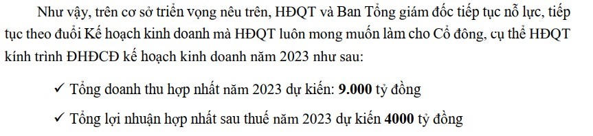 Còn tại Tổng Công ty Phát triển Đô thị Kinh Bắc - CTCP (mã: KBC), Ban lãnh đạo Đô thị Kinh Bắc nhận định tình hình kinh tế năm 2023 sẽ có nhiều diễn biến khó lường và còn nhiều khó khăn nên hạ thấp chỉ tiêu kinh doanh, cụ thể: tổng doanh thu hợp nhất năm 2023 dự kiến đạt 9.000 tỷ đồng và tổng lợi nhuận hợp nhất sau thuế dự kiến đạt 4.000 tỷ đồng, lần lượt giảm 8% và 11% so với kế hoạch của năm 2022.