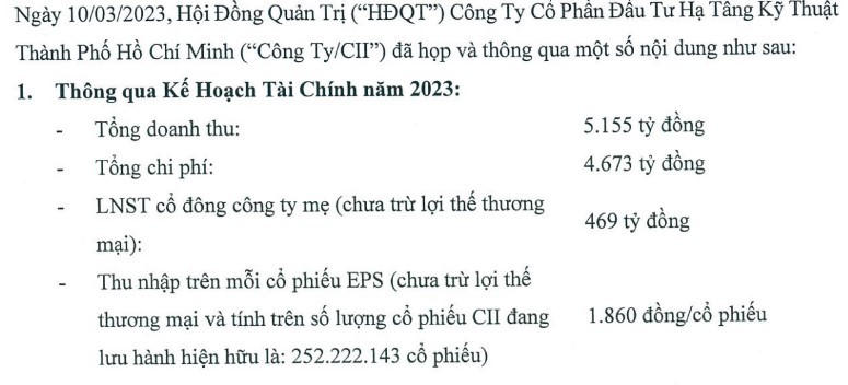 Đầu tư Hạ tầng Kỹ thuật TP.HCM (HOSE: CII) công bố kế hoạch kinh doanh năm 2023 với tổng doanh thu 5.155 tỷ đồng và lợi nhuận sau thuế cổ đông công ty mẹ (chưa trừ lợi thế thương mại) 469 tỷ đồng, giảm gần 36% so với năm 2022.