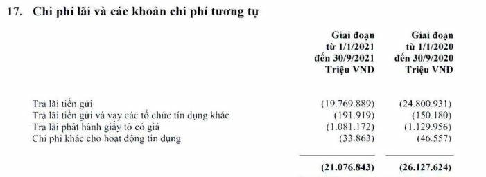 Do đó, thu nhập lãi thuần tăng chủ yếu nhờ huy động được vốn đầu vào giảm. Cụ thể, bảng thuyết minh tài chính tiền tệ của Vietcombank cho thấy, tiền gửi không kỳ hạn của khách hàng (CASA) tại thời điểm 30/9/2021 tăng gần 13%, lên hơn 346.860 tỷ đồng. Do đó, chi phí lãi và các chi phí tương tự đã giảm 19% xuống còn 21.077 tỷ đồng. Trong đó, trả lãi tiền gửi giảm mạnh nhất 20% xuống còn 19.770 tỷ đồng.
