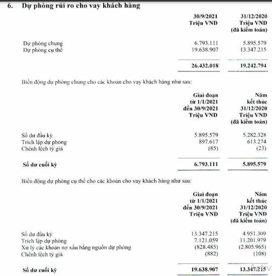 Liên quan tới dự phòng rủi ro cho vay khách hàng, tại thời điểm 30/9/2021, Vietcombank có trích lập 26.432 tỷ đồng, tăng 37% so với đầu năm.Trong đó, dự phòng cụ thể gần 19.639 tỷ đồng, tăng 47%. Tuy nhiên, trong kỳ Vietcombank cũng đã dùng hơn 828 tỷ đồng từ nguồn dự phòng để mạnh tay xử lý nợ xấu, tăng hoàn nhập và cải thiện lợi nhuận.