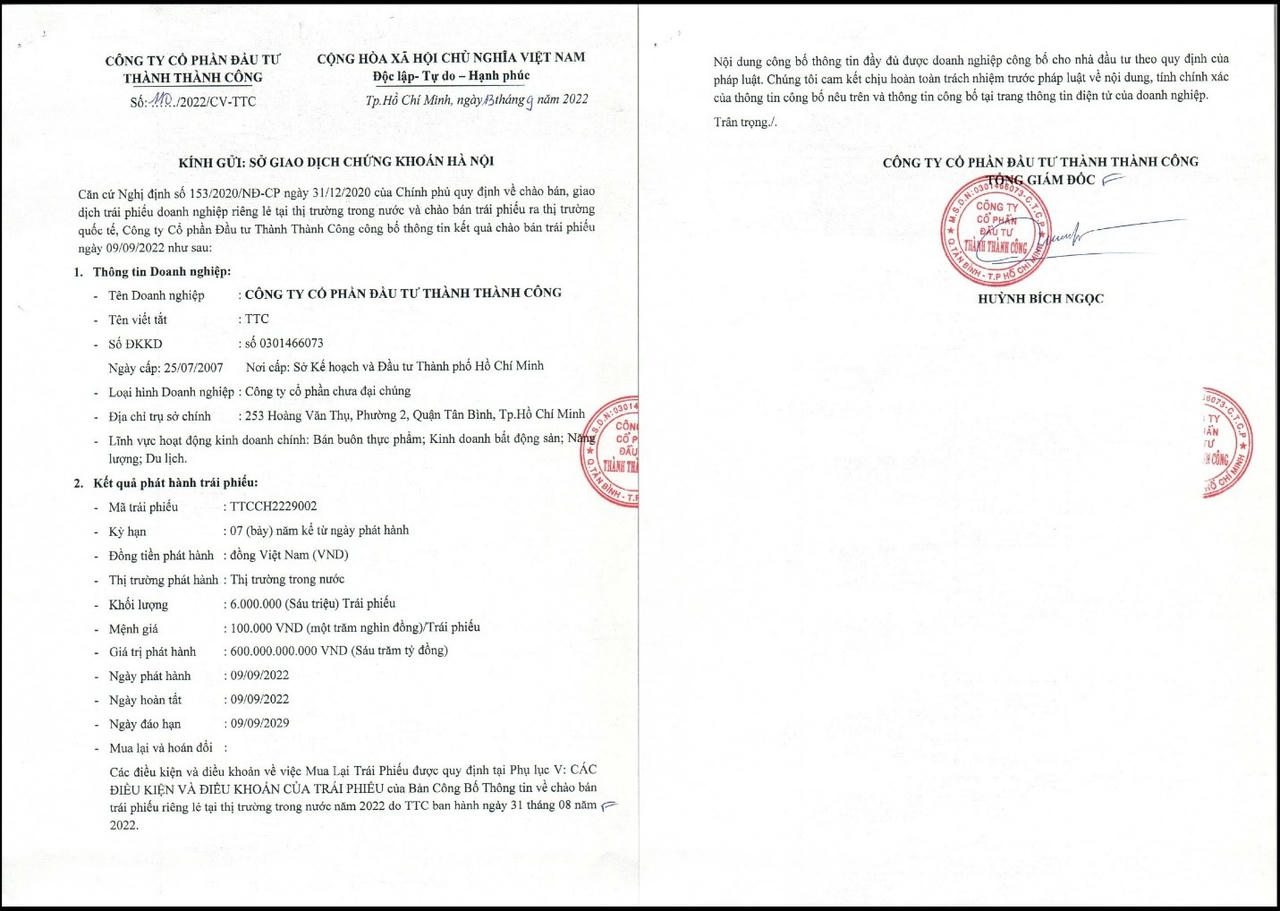 Cụ thể, theo thông tin từ Sở giao dịch Chứng khoán Hà Nội (HNX), Thành Thành Công vừa công bố thông tin về việc chào bán thành công lô trái phiếu có mã TTCCH2229002 với mệnh giá 100.000 đồng/trái phiếu. Phát hành và hoàn tất vào cùng ngày 09/09/2022, đáo hạn vào ngày 09/09/2029. Giá trị của lô trái phiếu là 600 tỷ đồng.