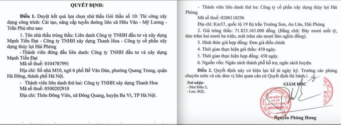 Ngày 3/10/2024, ông Nguyễn Văn Quyến, Phó giám đốc Sở Nông nghiệp và PTNT TP Hà Nội đã ký Quyết định phê duyệt kết quả lựa chọn nhà thầu Gói thầu số 04: Thi công xây dựng công trình Dự án: Sửa chữa mặt đê hữu Đà, đoạn từ K2+200 đến K8+200 đi qua địa bàn xã Sơn Đà, Tòng Bạt, huyện Ba Vì, thành phố Hà Nội. Công ty Xây dựng Thanh Hoa trúng thầu với vai trò liên danh, giá trúng thầu là 39.759.578.000 đồng (giá dự toán gói thầu là 39.880.090.000 đồng), tiết kiệm hơn 120 triệu đồng (hơn 0,3%) cho ngân sách nhà nước.