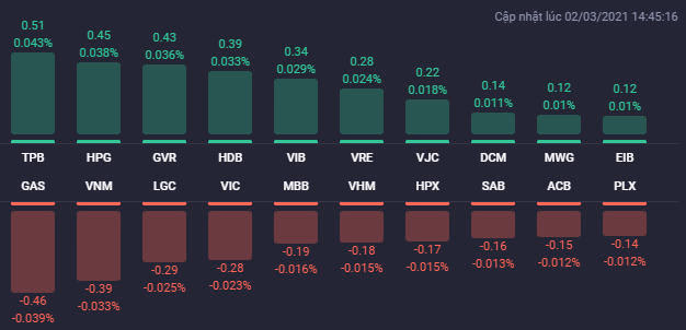 VN-Index may mắn giữ được sắc xanh vào cuối phiên khi các cổ phiếu như TPB, HDB, VIB, GVR, HPG, VJC… tăng giá rất mạnh. TPB tăng đến 6,3% lên 29.750 đồng/cp, HDB tăng 3,5% lên 26.700 đồng/cp, VIB tiếp tục tăng 2,7% lên 43.600 đồng/cp.