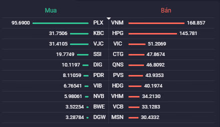Thanh khoản trên hai sàn niêm yết giảm so với phiên trước đó và tiếp tục thấp hơn mức trung bình 20 phiên với giá trị giao dịch đạt 17.329 tỷ đồng tương ứng với khối lượng giao dịch 696 triệu cổ phiếu, trong đó giao dịch thỏa thuận chiếm 1.652 tỷ đồng. Trong top 10 cổ phiếu khớp lệnh mạnh nhất thị trường vẫn chỉ có duy nhất một mã bất động sản là FLC với 15,8 triệu đơn vị.
