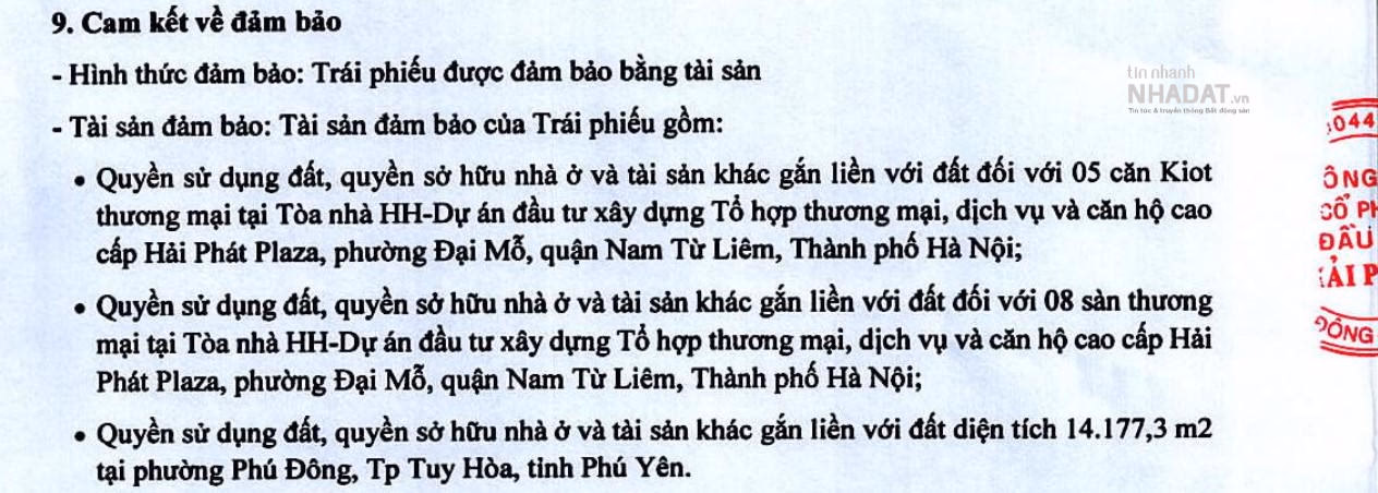 Theo thông tin được công bố cho biết, lô trái phiếu trên được đảm bảo bằng nhiều tài sản là bất động sản tại Hà Nội. Cụ thể các trái phiếu được đảm bảo bằng quyền sử dụng đất, quyền sở hữu nhà, các tài sản gắn liền với đất đối với 5 căn kiot thương mại và 8 sàn thương mại tại tòa nhà HH, thuộc dự án Tổ hợp thương mại, dịch vụ và căn hộ cao cấp Hải Phát Plaza (phường Đại Mỗ, quận Nam Từ Liêm, TP Hà Nội).