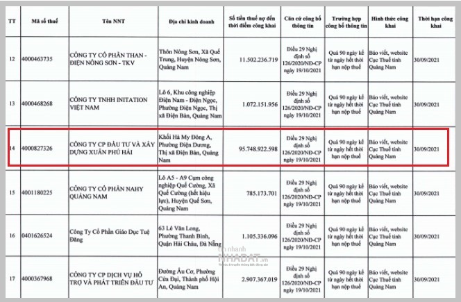 Liên quan đến Xuân Phú Hải, vừa qua công ty bất ngờ có tên trong danh sách doanh nghiệp bất động sản nợ thuế trăm tỷ tại Quảng Nam. Thậm trí còn đứng đầu doanh sách với số tiền chậm nộp lớn nhất (95,7 tỷ đồng).