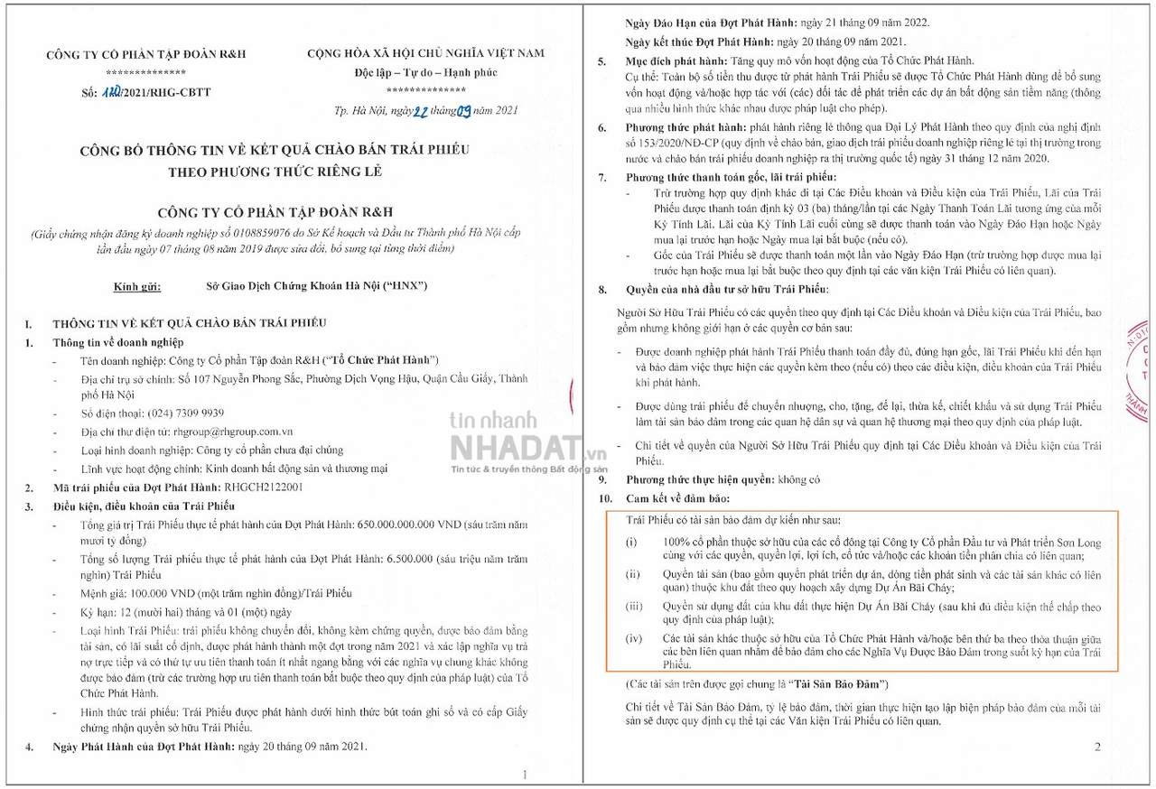 Lô trái phiếu của R&H được bảo đảm bằng 100% cổ phần thuộc sở hữu của các cổ đông tại CTCP Đầu tư và Phát triển Sơn Long và quyền tài sản, quyền sử dụng đất thuộc khu đất theo quy hoạch xây dựng dự án Bãi Cháy.