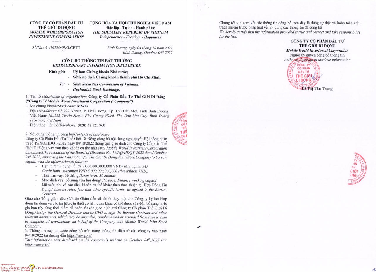 HĐQT CTCP Đầu tư Thế giới Di động (Mã CK: MWG) vừa thông qua nghị quyết về việc cho công ty con là CTCP Thế giới Di động vay vốn với hạn mức tín dụng tối đa 5,000 tỷ đồng trong thời hạn 36 tháng.