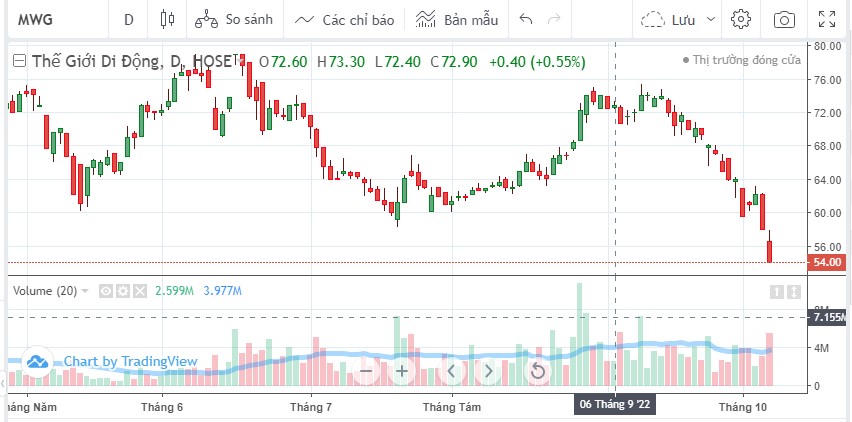 Trên thị trường chứng khoán, sau phiên tăng 1,97% vào ngày 5/10, thị giá cổ phiếu MWG ghi nhận 2 phiên giảm giá liên tiếp, trong đó kết phiên cuối tuần ngày 7/10, cổ phiếu cuả Thế giới Di động giảm sàn về mức 54.000 đồng/ cổ phiếu.