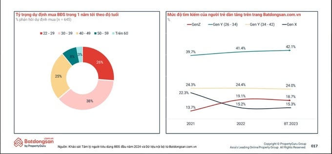 Trong nghiên cứu mới đây PropertyGuru chỉ ra, độ tuổi từ 22 đến 39 hiện là nhóm khách có nhu cầu mua nhà chủ lực, thay thế nhóm trung lưu trên 40 tuổi như trước đây. Tỉ lệ tìm mua của nhóm khách trẻ liên tục tăng mạnh. Trong đó, nhóm tuổi 22-34 tăng từ 39% (2021) lên 42% (2023). Gen Z (nhóm tuổi 22-26) bứt phá khi lượng tìm mua từ 13% (2021) lên gần 19% (2023), cho thấy xu hướng trẻ hoá trong sở hữu bất động sản.