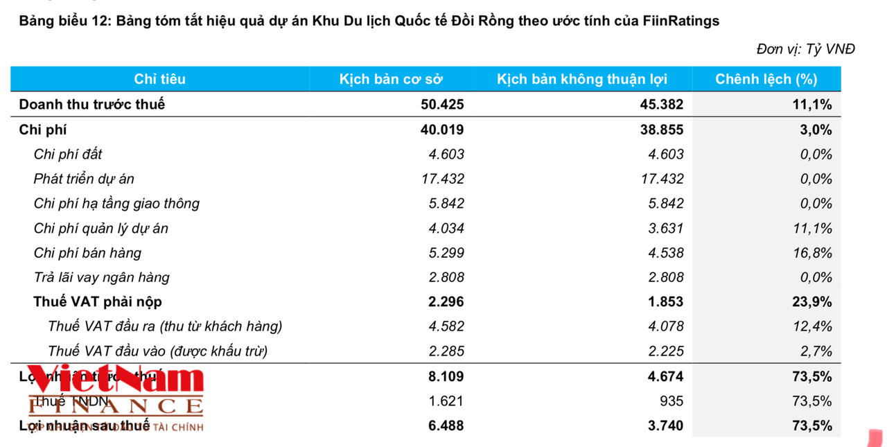 Trong kịch bản không thuận lợi, FiinRatings điều chỉnh tổng doanh thu hạng mục biệt thự nghỉ dưỡng trước thuế về mức 45.382 tỷ đồng, tương đương mức giá bán dao động trong khoảng 52 - 74 triệu đồng/m2 (điều chỉnh giảm 10% so với kịch bản cơ sở), giảm chi phí bán hàng và chi phí quản lý dự án, đồng thời giữ nguyên các chi phí khác. Theo kịch bản kiểm thử này, dự án sẽ đem lại lợi nhuận sau thuế khoảng 3.740 tỷ đồng.