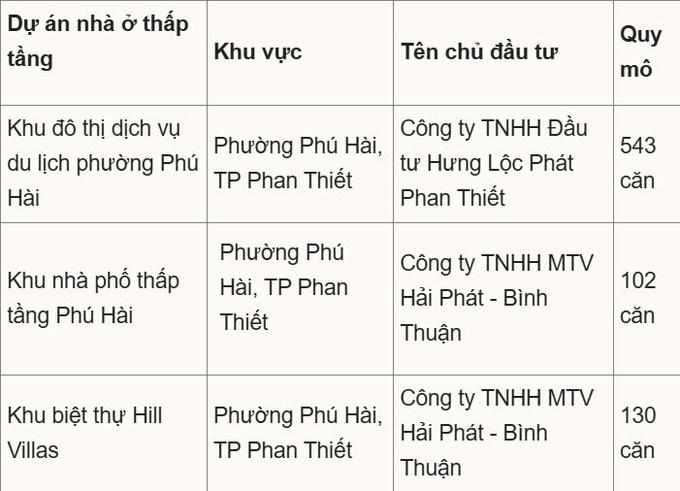 Danh sách 3 dự án nhà ở thương mại tại Bình Thuận được cấp phép bán nhà ở hình thành trong tương lai bao gồm: Khu nhà phố thấp tầng với quy mô 543 căn, thuộc dự án Khu đô thị dịch vụ du lịch phường Phú Hài, do Công ty Bất động sản Hưng Lộc Phát - Phan Thiết làm chủ đầu tư; dự án khu nhà phố thấp tầng Phú Hài của Công ty Hải Phát - Bình Thuận; và 130 căn biệt thự thuộc dự án Hill Villas do Công ty Cổ phần Khai thác và Phát triển Quỹ đất DMP Group thực hiện. Cả ba dự án này đều tọa lạc tại phường Phú Hài, TP Phan Thiết.