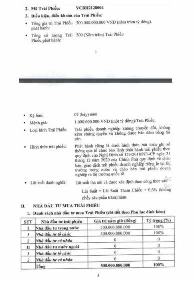 Mới đây nhất, Ngân hàng TMCP Ngoại thương Việt Nam (Vietcombank - mã: VCB) vừa công bố kết quả chào bán trái phiếu riêng lẻ. Cụ thể, hôm 24/11, Vietcombank đã chào bán thành công 500 tỷ đồng trái phiếu kỳ hạn 7 năm và 500 tỷ đồng trái phiếu kỳ hạn 10 năm.