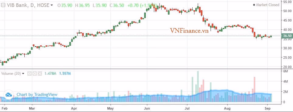 Cụ thể, giai đoạn từ 1/6 - 7/9, giá cổ phiếu VIB giảm 49%, xuống mức 36.500 đồng/cp; cổ phiếu STB giảm 14% về giá 27.900 đồng/cp; cổ phiếu ACB giảm 23% dừng ở mức 32.500 đồng/cp; cổ phiếu MBB giảm 25% xuống còn 28.600 đồng/cp; cổ phiếu BID giảm 17% dừng ở giá 39.700 đồng/cp;...