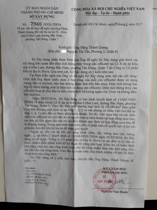 | Bức xúc trước cách xử lý này của Novaland, ngày 14/3/2017, anh Quang đã khiếu nại sự việc lên Sở Xây dựng TP.HCM. Trong văn bản trả lời ngày 5/6/2017, Sở Xây dựng TP.HCM cho biết việc xác định mua bán và xác định diện tích officetel do chủ đầu và người mua tự thỏa thuận tại hợp đồng mua bán. Các bên có liên quan cần căn cứ các điều khoản quy định tại hợp đồng mua bán để tự thương lượng. Trong quá trình thực hiện, nếu có phát sinh về quyền lợi và lợi ích giữa các bên thì liên hệ tòa án để được giải quyết. Cũng theo Sở Xây dựng, chủ đầu tư hoàn toàn chịu trách nhiệm về tính ổn định và an toàn của công trình”. |
